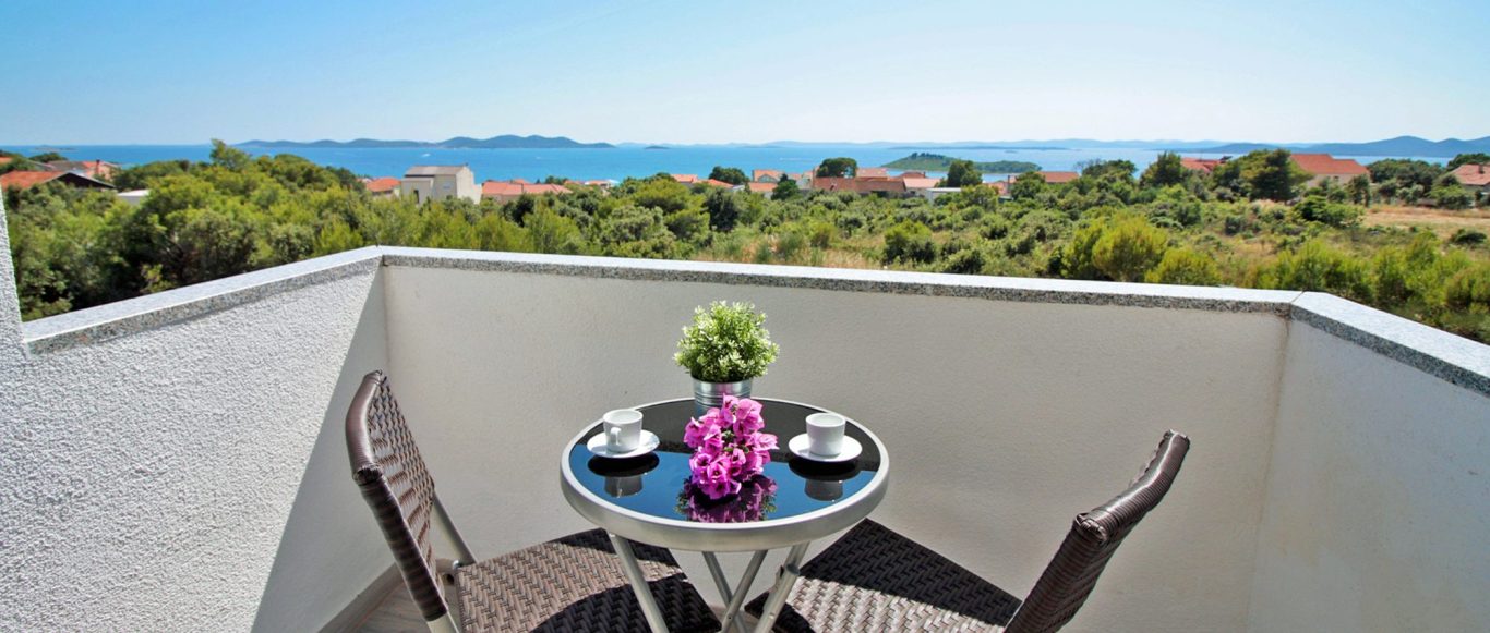 Balcony with amazing view to the Adriatic Sea, Vrgada and Kornati islands.