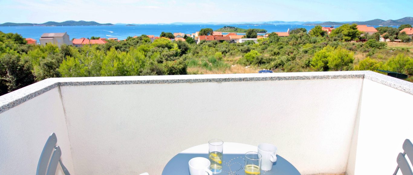 Balcony with view to the Adriatic Sea, Vrgada and Kornati islands.